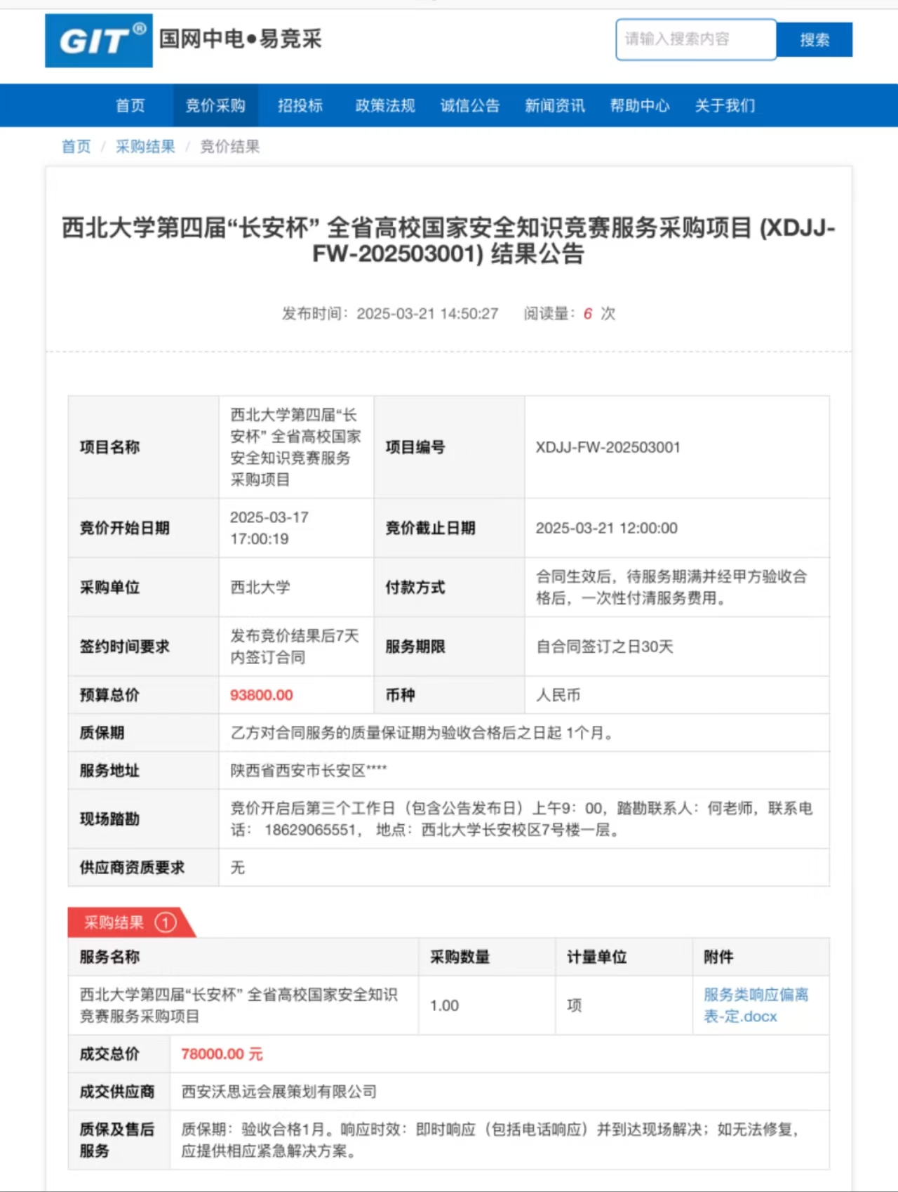 乐投平台第四届“长安杯” 全省高校国家安全知识竞赛服务采购项目 (XDJJ-FW-202503001) 竞价结果公告 作者: 编辑:党丹珩 时间:2025-03-21 原链接地址:https://www.ejingcai.com.cn/site/bidding/detail/17086