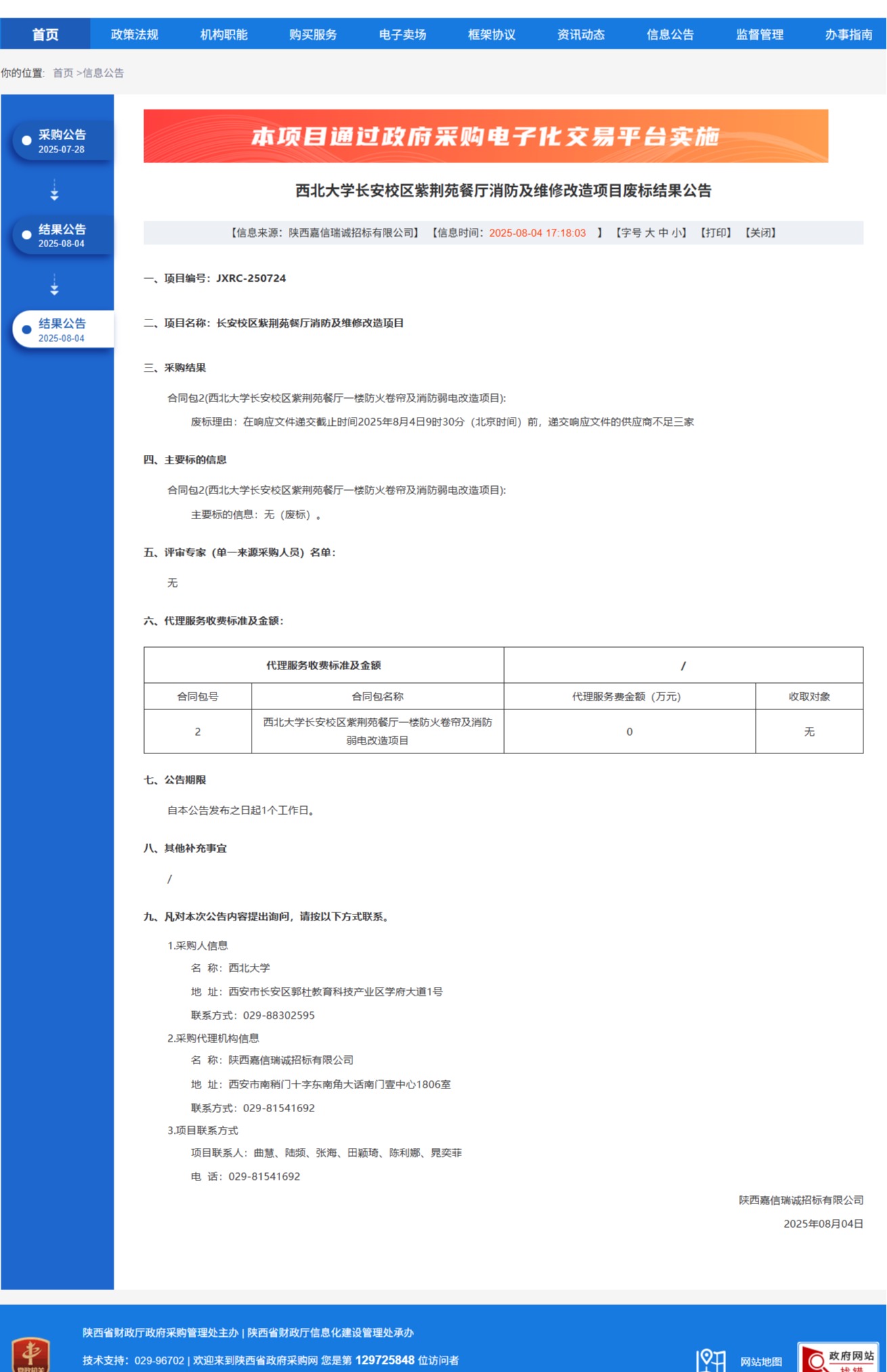 乐投平台长安校区紫荆苑餐厅消防及维修改造项目废标结果公告 作者: 编辑:党丹珩 时间:2025-08-04 公告地址:http://www.ccgp-shaanxi.gov.cn/freecms/site/shaanxi/ggxx/info/2025/8a69c0c89860f6020198742efac05b51.html?noticeType=001006¬iceId=f838eaa2-7115-11f0-8063-08c0eb20c666