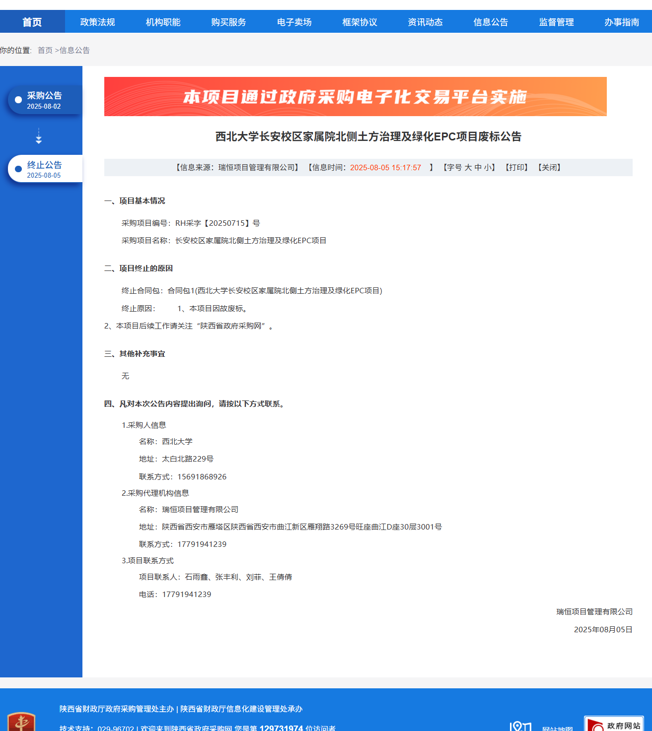 乐投平台长安校区家属院北侧土方治理及绿化EPC项目废标公告 作者: 编辑:党丹珩 时间:2025-08-05 公告地址:http://www.ccgp-shaanxi.gov.cn/freecms/site/shaanxi/ggxx/info/2025/8a69c8f99860f21c0198790d379441f5.html?noticeType=001004¬iceId=5c6803f0-71ce-11f0-8063-08c0eb20c666