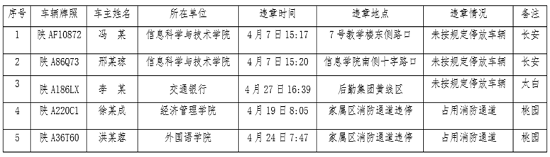 2023年4月份校园交通违章曝光 作者: 编辑: 时间:2023-05-10 为加强校内道路交通管理,规范校内交通秩序,根据《乐投平台校园道路交通管理办法》的通知要求,现将2023年4月校园交通违章车辆曝光如下。 希望广大师生员工遵守校园道路交通管理办法,维护校园交通安全,共同营造良好的校园交通秩序。 乐投平台道路交通安全委员会 2023年5月10日
