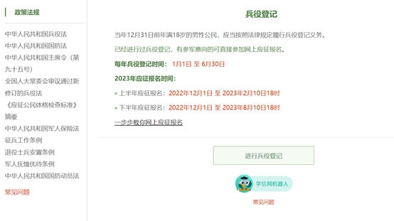 在这个页面中,会告知我们报名时间以及参军的政策说明,建议看后,点击“进行兵役登记”,迈出你军旅生涯的第一步。