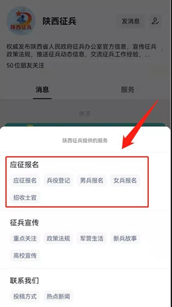 方式二:关注“陕西征兵”公众号,点击菜单栏“应征报名”直通报名页面。