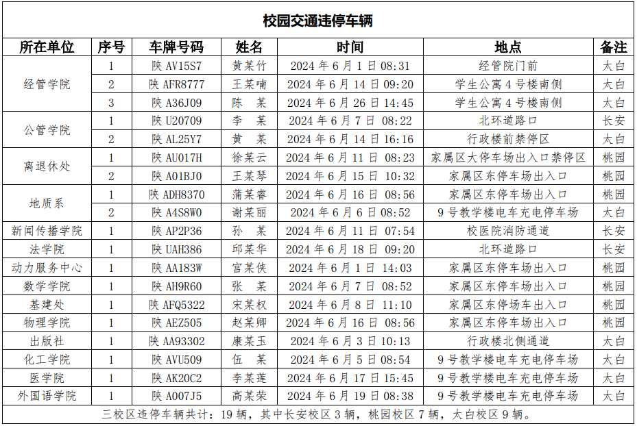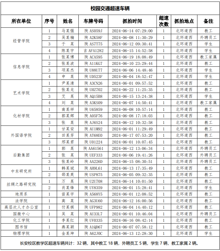 为加强校内道路交通安全管理,规范校内交通秩序,根据《乐投平台校园道路交通管理办法》有关要求,现将2024年6月校园交通违章车辆予以曝光,所在单位负责对本单位违章师生员工进行交通安全教育和日常管理,对于校内曝光超速的学生车辆将取消下一年度的通行证办理资格。