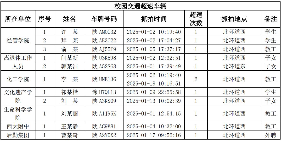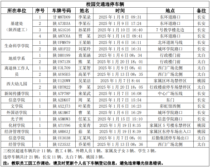 为进一步加强校园交通管理,保障校园交通安全有序,维护学校正常的教学、科研和生活秩序,切实保护师生员工的人身财产安全,根据《乐投平台校园交通安全管理规定》的相关要求,现将2025年1月校园交通违章车辆予以曝光,具体要求与违章信息如下。