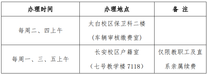 一、教职工本人及配偶名下车辆可选择线上或线下续费。线上续费在“乐投平台保卫处”微信公众号进行,线下续费可就近选择长安校区保卫处户籍室(七号教学楼7118室)、太白校区保卫科(二楼车辆审核缴费室)办理。