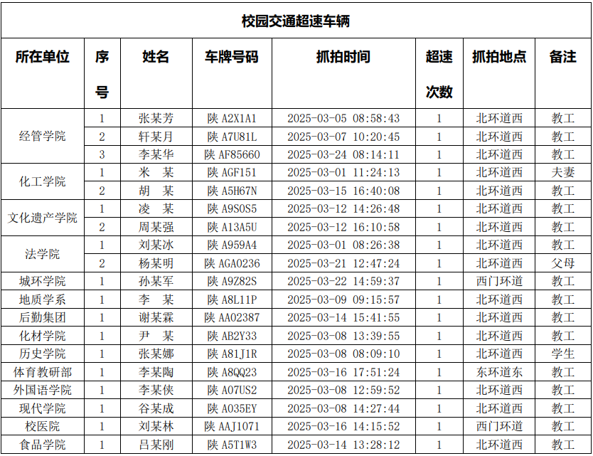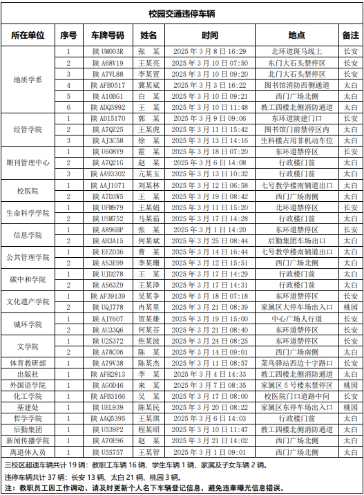 为进一步加强校园交通管理,保障校园交通安全有序,维护学校正常的教学、科研和生活秩序,切实保护师生员工的人身财产安全,根据《乐投平台校园交通安全管理规定》的相关要求,现将2025年3月校园交通违章车辆予以曝光,具体要求与违章信息如下:
