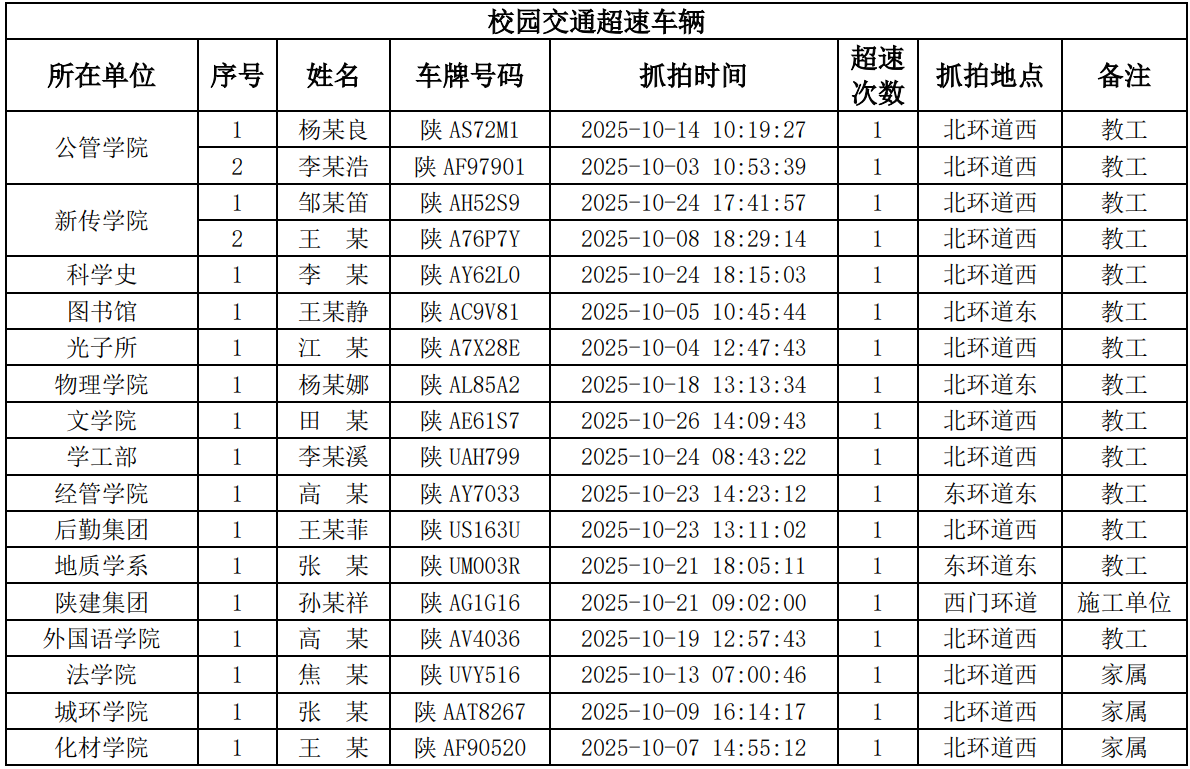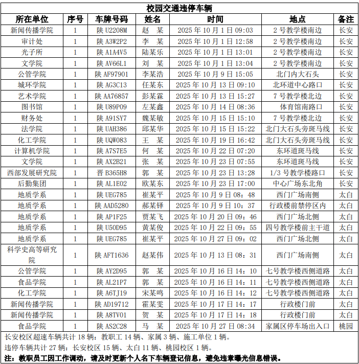 为进一步加强校园交通管理,保障校园交通安全有序,维护学校正常的教学、科研和生活秩序,切实保护师生员工的人身财产安全,根据《乐投平台校园交通安全管理规定》的相关要求,现将2025年10月校园交通违章车辆予以曝光,具体要求与违章信息如下: