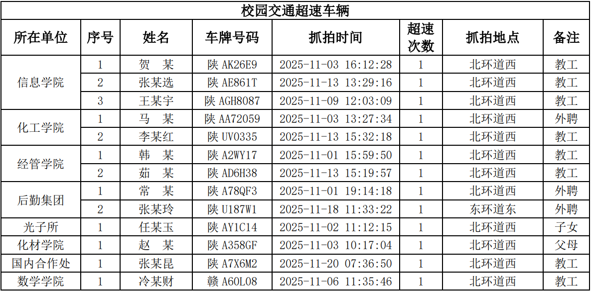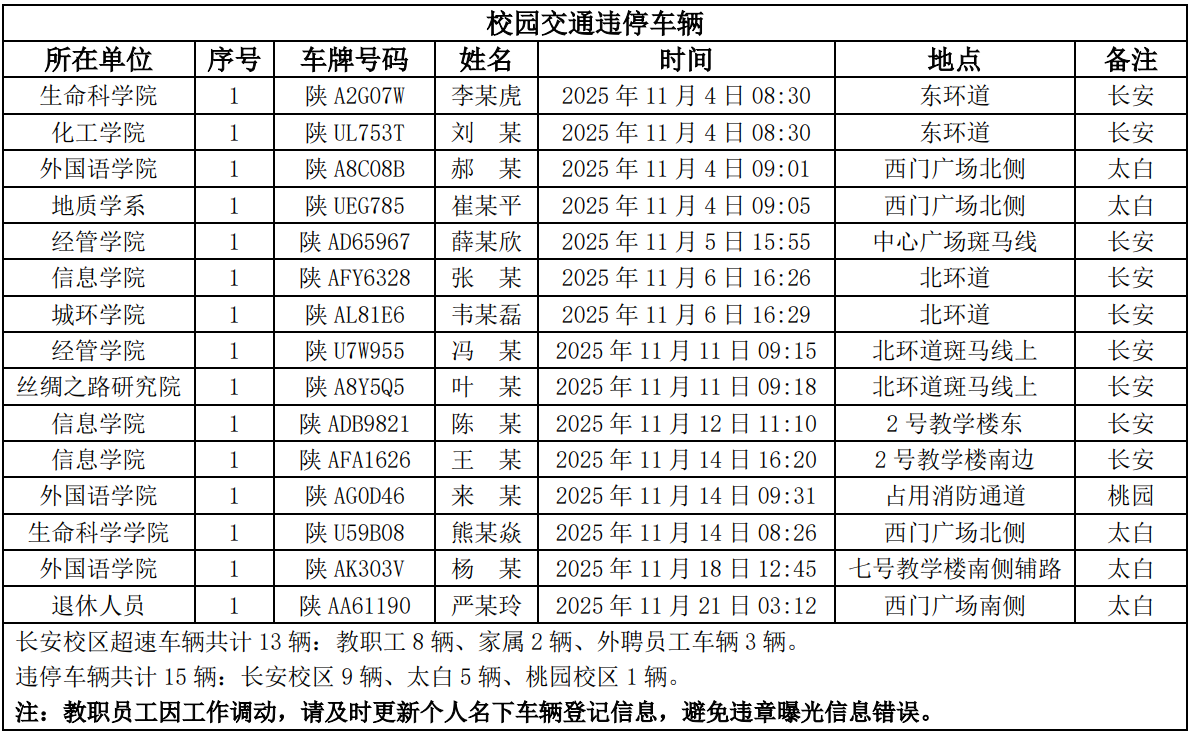 为进一步加强校园交通管理,保障校园交通安全有序,维护学校正常的教学、科研和生活秩序,切实保护师生员工的人身财产安全,根据《乐投平台校园交通安全管理规定》的相关要求,现将2025年11月校园交通违章车辆予以曝光,具体要求与违章信息如下: