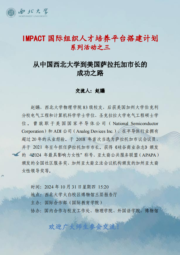 IMPACT国际组织人才培养平台搭建计划系列活动之三:从中国乐投平台到美国萨拉托加市长的成功之路 作者: 编辑:张兆慧 时间:2024-10-28 (撰稿人:国际部出国办 发布人:张兆慧 审核人:任惠莲)
