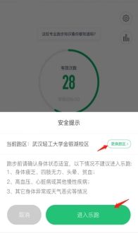 点击“进入乐跑”,弹出安全提示,点击进入乐跑,开始跑步;点击“更换跑区”,进入乐跑设置(可见3.2),更换跑区;