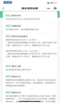 本学期从9月18日(第4教学周)开始起,跑步不少于28次,每次不少于 2 公里,总里程不少于80公里。跑步成绩一天只记录一次有效成绩,男、女生同等。单次里程最低是2公里,低于2公里无效,上限10公里,超10公里的只按10公里计算,但实际运动数据会在app保留。
