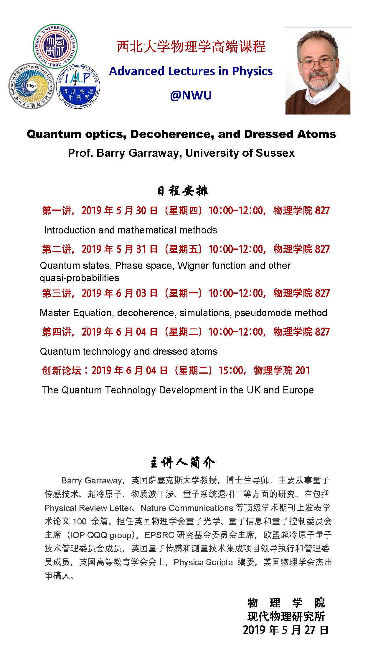 乐投平台物理学高端课程--Quantum optics, Decoherence, and Dressed Atoms