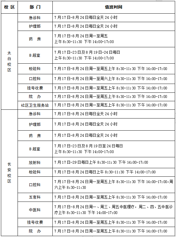 2023年校医院暑假期间医疗工作安排 作者: 编辑: 时间:2023-07-17 全体师生员工及社区居民: 根据学校《关于2023年暑假安排的通知》,为持续做好校内医疗保障,结合医院实际情况,现将暑假期间(7月17日至8月24日)校医院医疗工作安排通知如下: 一、医院值班安排 二、医院值班电话 太白校区: 029-88303120(急诊科) 029-88302922(办公室) 长安校区: 029-88309120(急诊科) 029-88308200(办公室) 乐投平台医院 2023年7月17日
