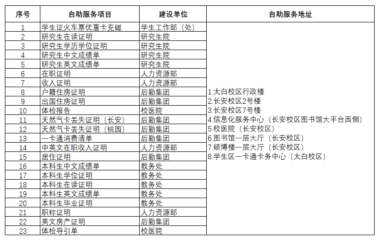 一、信息化自助服务。提供相关材料自助打印服务,服务项目及自助打印机地址等详见下表。自助服务同步支持线上服务,打开微信小程序“校务行”,登录后选择所要打印的证明材料,提供一个电子邮箱地址,证明材料的电子版(PDF格式)便发送到该邮箱。具体使用方法请参考:/info/1247/19210.htm。
