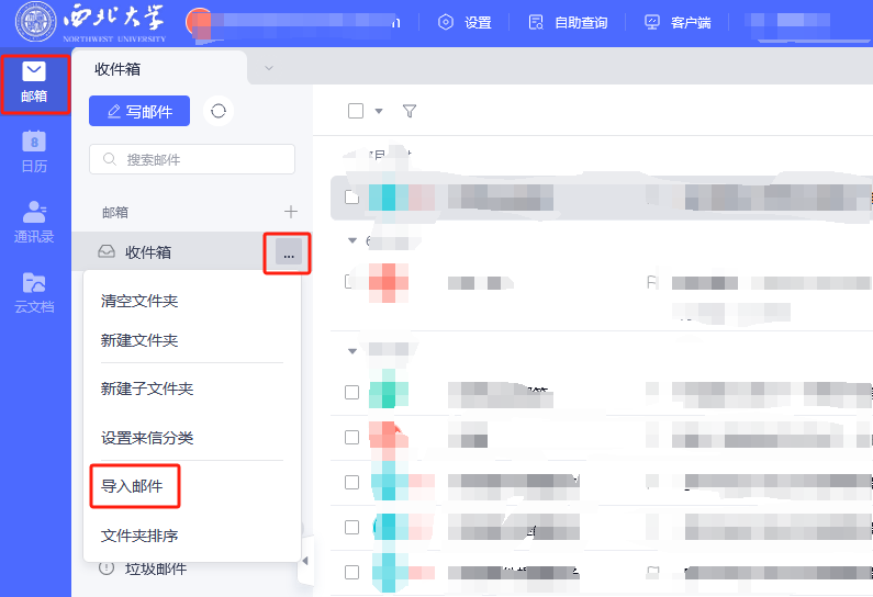 登录邮箱后,依次点击“邮箱”->“收件箱旁边的...”->“导入邮件”->“Ctrl+A选择全部邮件”。