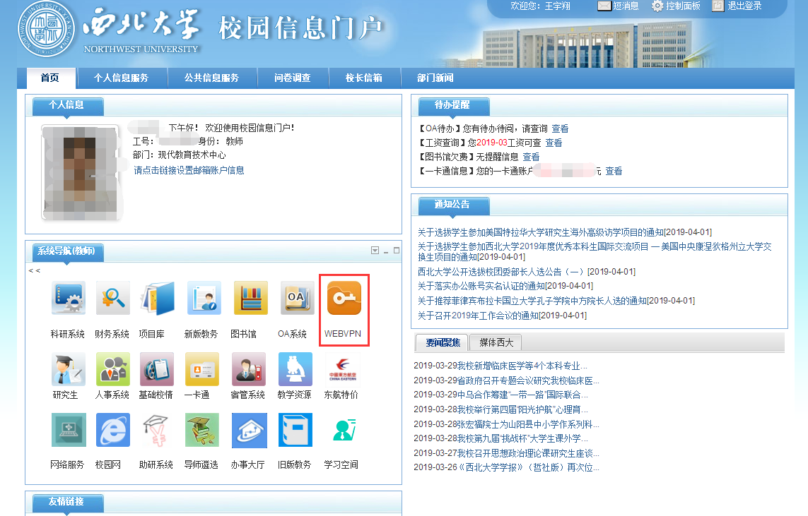 登陆校园信息门户后,在系统导航中点击“WEBVPN”。