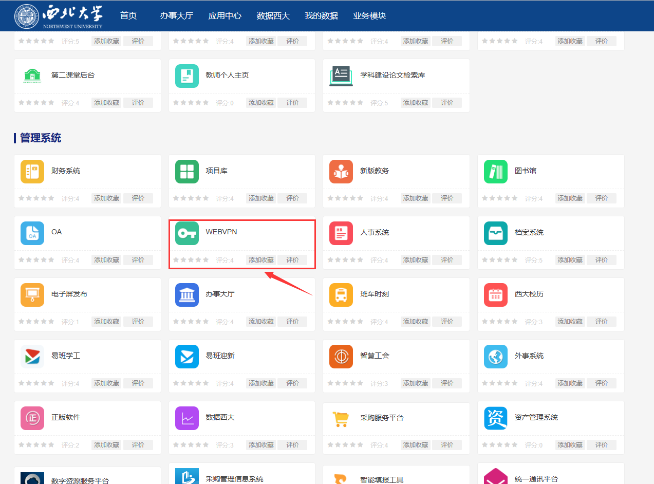 在浏览器中输入https://webvpn.nwu.edu.cn 跳转至统一身份认证,认证成功后即可进入VPN的主页,可以点击需要的链接进行访问。