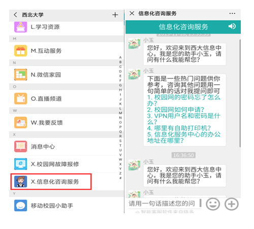 第二步:在“乐投平台”微信企业号中点击“X.信息化咨询服务”,信息化智能客服小玉将为您解答信息化服务问题。