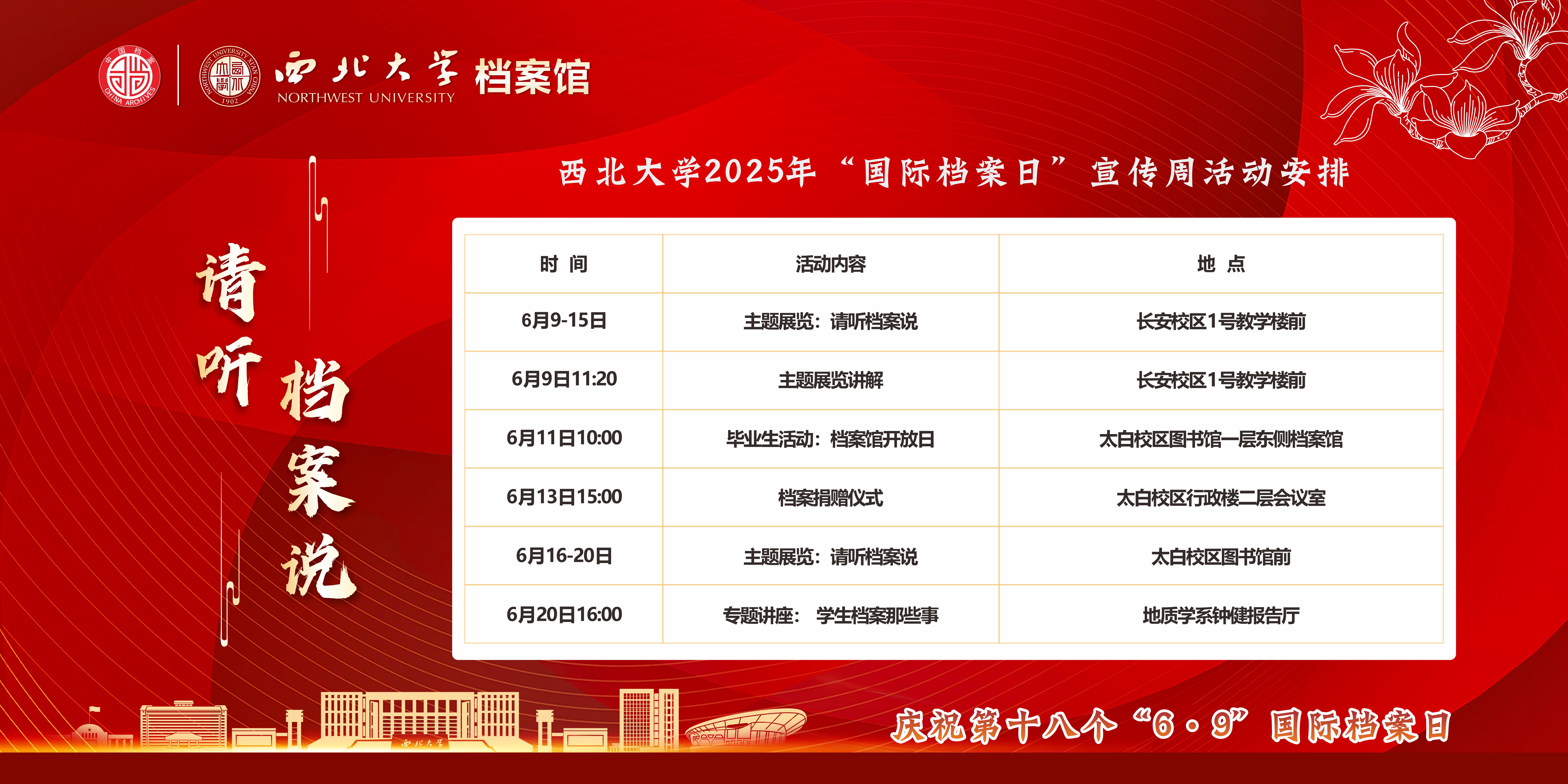 乐投平台2025年国际档案日宣传周活动安排 作者: 编辑:孙可佳 时间:2025-06-07 根据2025年全国档案宣传工作要点以及国际档案日系列宣传活动安排,为进一步展现档案工作价值,增强师生档案意识,充分发挥档案存史资政育人的作用,学校举办主题为“请听档案说”的国际档案日宣传周活动。具体活动安排如下,欢迎广大师生参加!