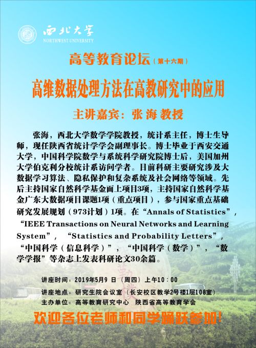乐投平台"高等教育论坛"(第十六期) 作者: 编辑: 时间:2019-05-07 14:35 校内各有关单位: 乐投平台“高等教育论坛”第十六期即将举行,现将具体情况通知如下: 讲座题目:高维数据处理方法在高教研究中的应用主讲嘉宾:张 海 教授讲座时间:2019年5月9 日(周四)上午10:00讲座地点:研究生院会议室(长安校区教学2号楼1层108室)主办单位:高等教育研究中心、陕西省高等教育学会欢迎各位老师和同学踊跃参加!联系人:伍小东 029-88308864