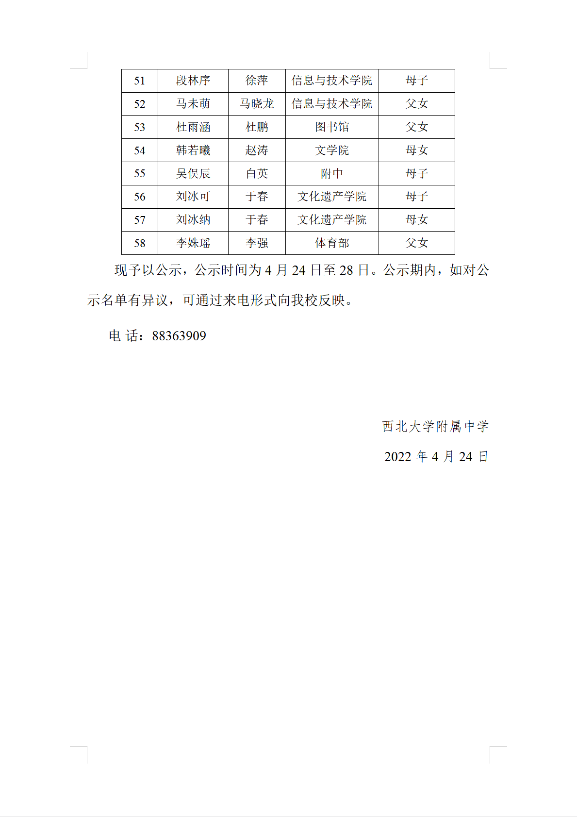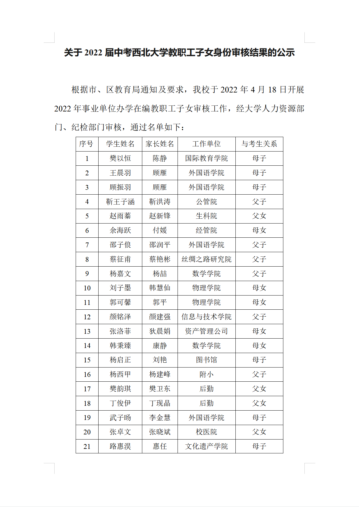 关于2022届中考乐投平台教职工子女身份审核结果的公示