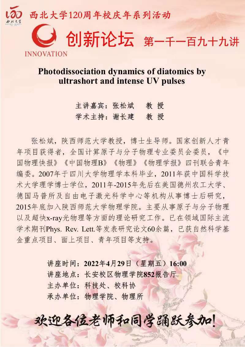 乐投平台创新论坛第一千一百九十九讲暨120周年校庆年系列活动:Photodissociation dynamics of diatomics by ultrashort and intense UV pulses 作者:张松斌 教授 编辑:杨钊 时间:2022-04-26