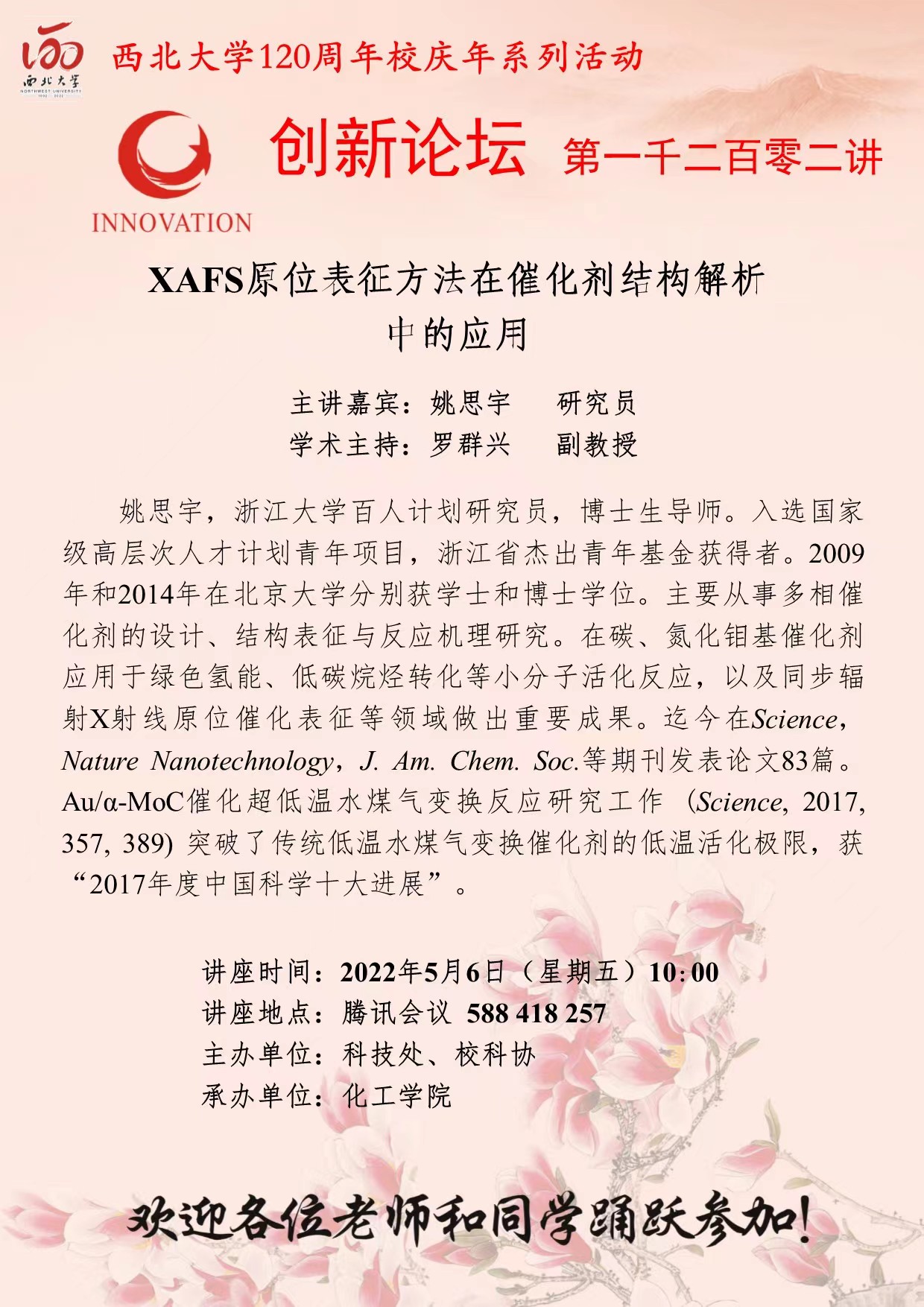乐投平台创新论坛第一千二百零二讲暨120周年校庆年系列活动:XAFS原位表征方法在催化剂结构解析中的应用