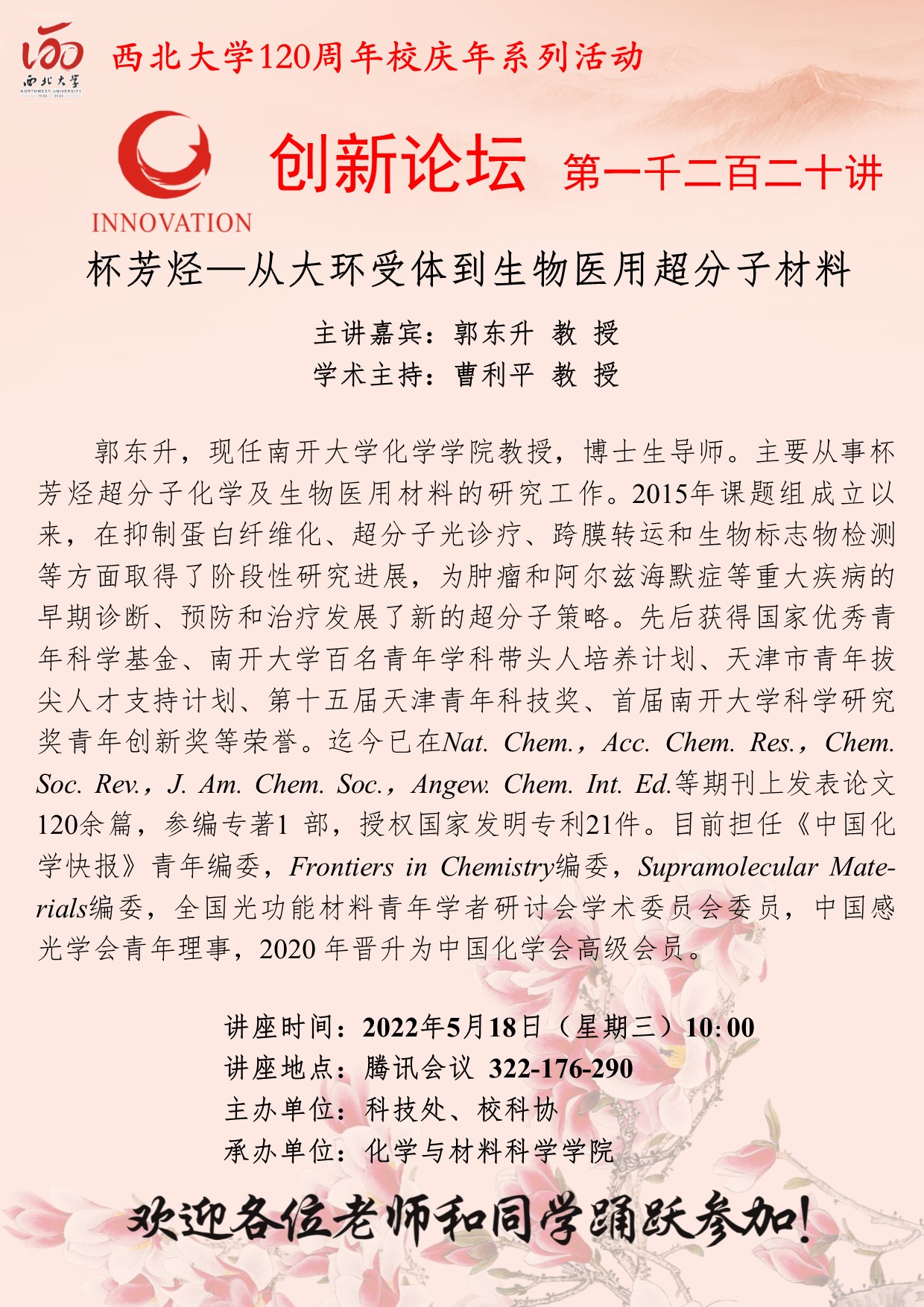 乐投平台创新论坛第一千二百二十讲暨120周年校庆年系列活动:杯芳烃—从大环受体到生物医用超分子材料