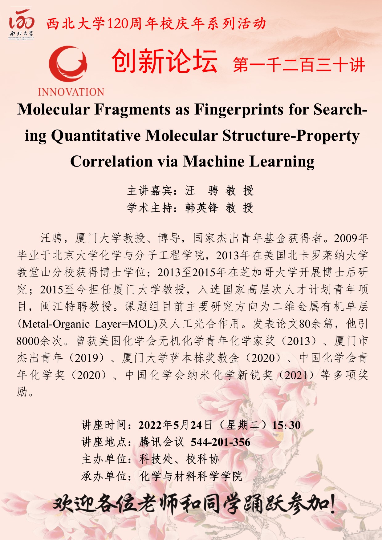 乐投平台创新论坛第一千二百三十讲暨120周年校庆年系列活动:Molecular Fragments as Fingerprints for Searching Quantitative Molecular Structure-Property Correlation via Machine Learning 作者:汪骋 教授 编辑: 时间:2022-05-23