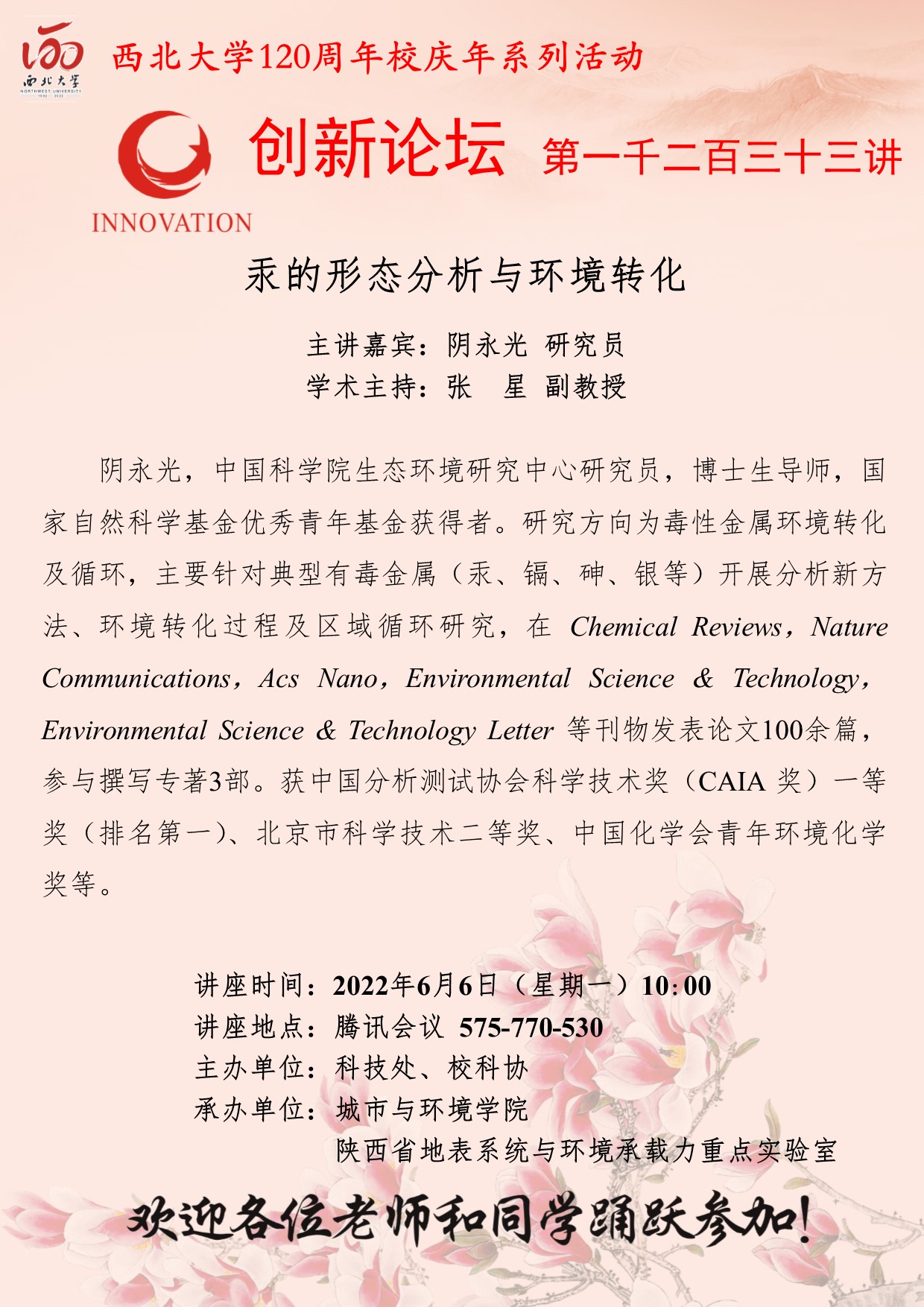 乐投平台创新论坛第一千二百三十三讲暨120周年校庆年系列活动:汞的形态分析与环境转化