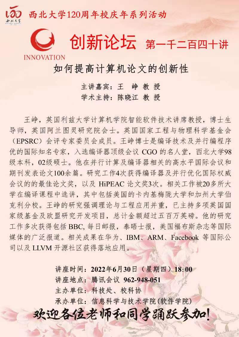 乐投平台创新论坛第一千二百四十讲暨120周年校庆年系列活动:如何提高计算机论文的创新性