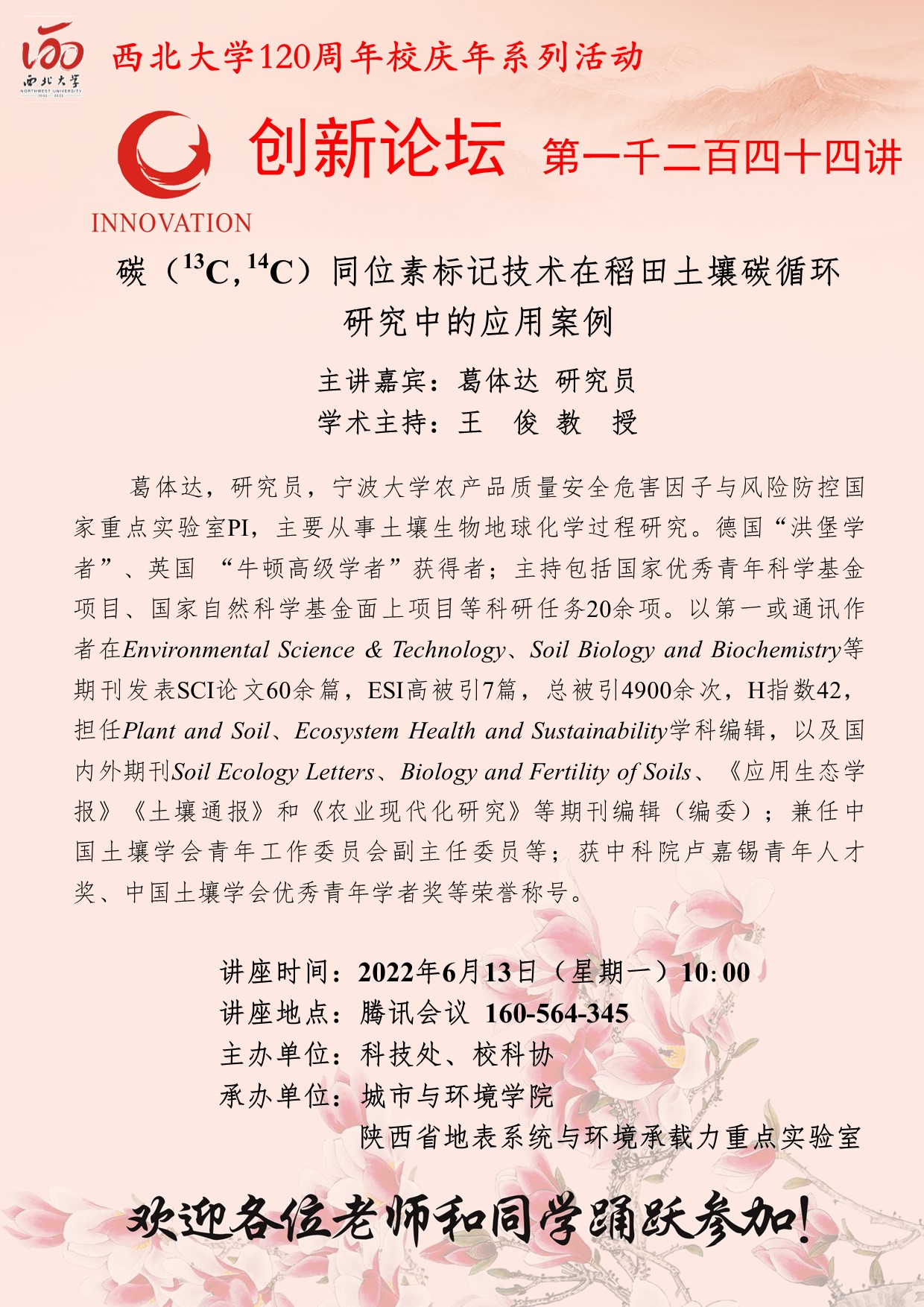 乐投平台创新论坛第一千二百四十四讲暨120周年校庆年系列活动:碳(13C,14C)同位素标记技术在稻田土壤碳循环研究中的应用案例