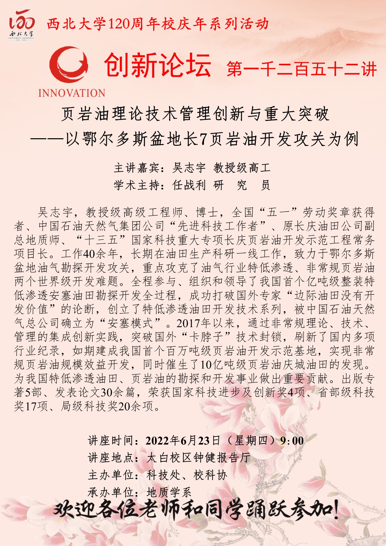 乐投平台创新论坛第一千二百五十二讲暨120周年校庆年系列活动:页岩油理论技术管理创新与重大突破——以鄂尔多斯盆地长7页岩油开发攻关为例