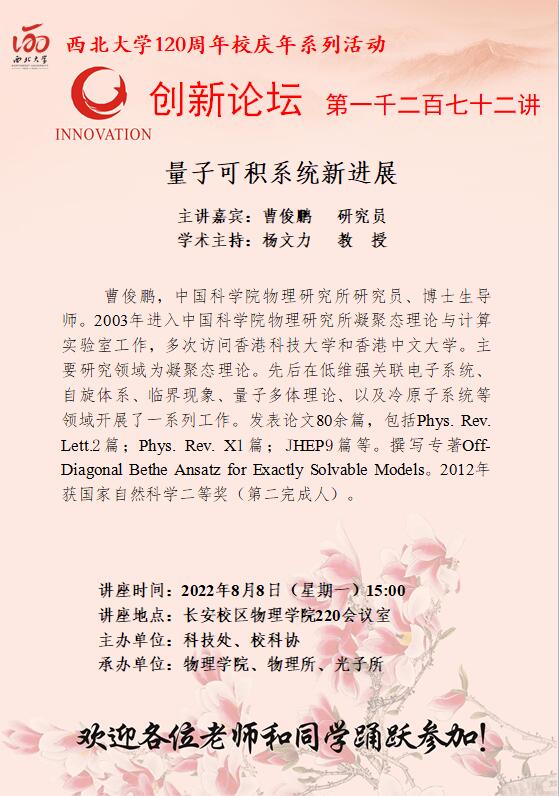 乐投平台创新论坛第一千二百七十二讲暨120周年校庆年系列活动:量子可积系统新进展