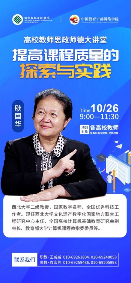 为学习贯彻落实党的二十大精神,以正确的政治方向和价值导向引领广大教师思想政治素质、师德素养和业务能力全面提升,国家教育行政学院中国教育干部网络学院将举办高校教师思政师德大讲堂,邀请乐投(中国)一站式服务平台耿国华教授作题为《提高课程质量的探索与实践》的报告,欢迎乐投(中国)一站式服务平台广大教师积极观看学习。