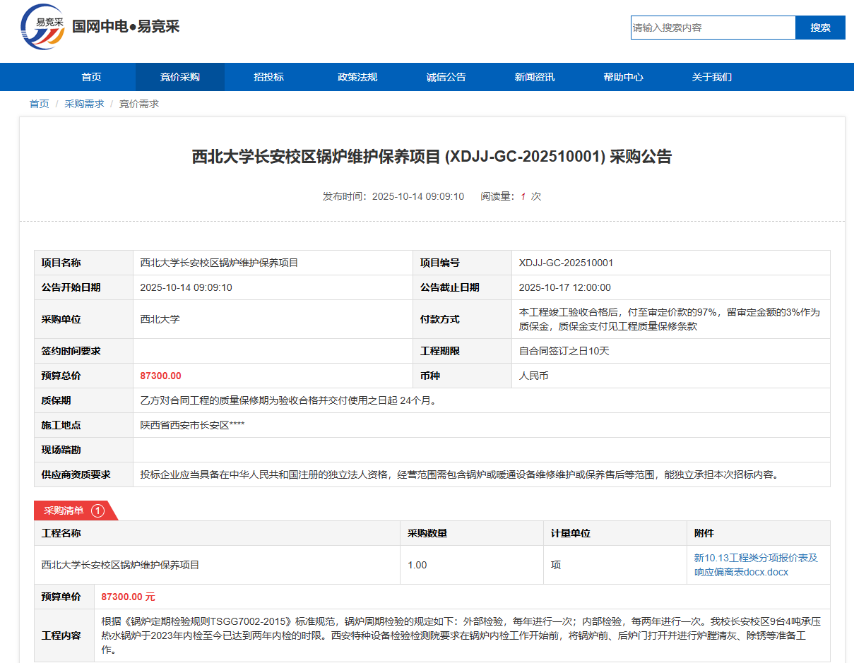 乐投平台长安校区锅炉维护保养项目(XDJJ-GC-202510001)竞价采购公告