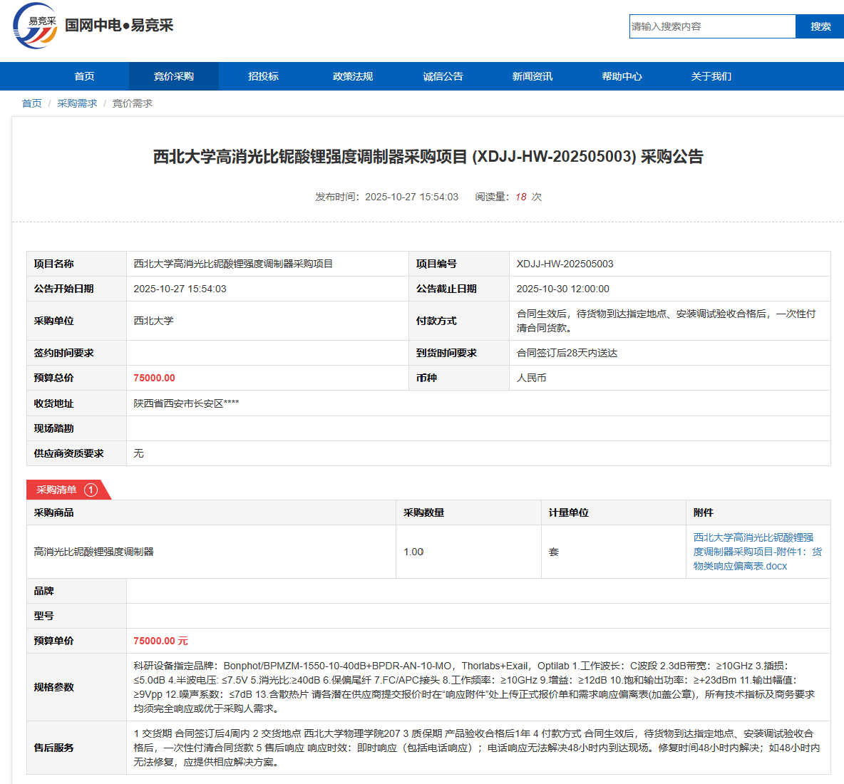 乐投平台高消光比铌酸锂强度调制器采购项目(XDJJ-HW-202505003)竞价采购公告