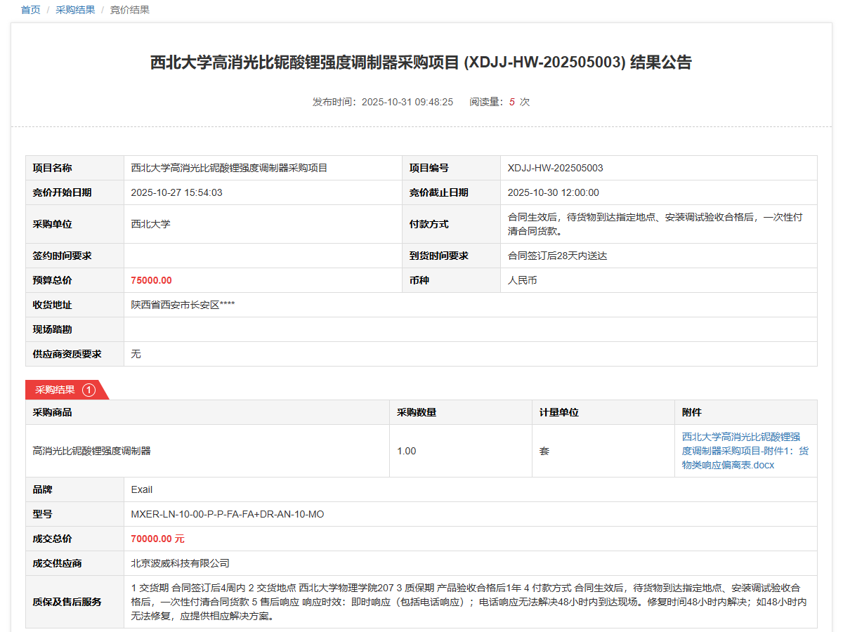 乐投平台高消光比铌酸锂强度调制器采购项目(XDJJ-HW-202505003)竞价结果公告