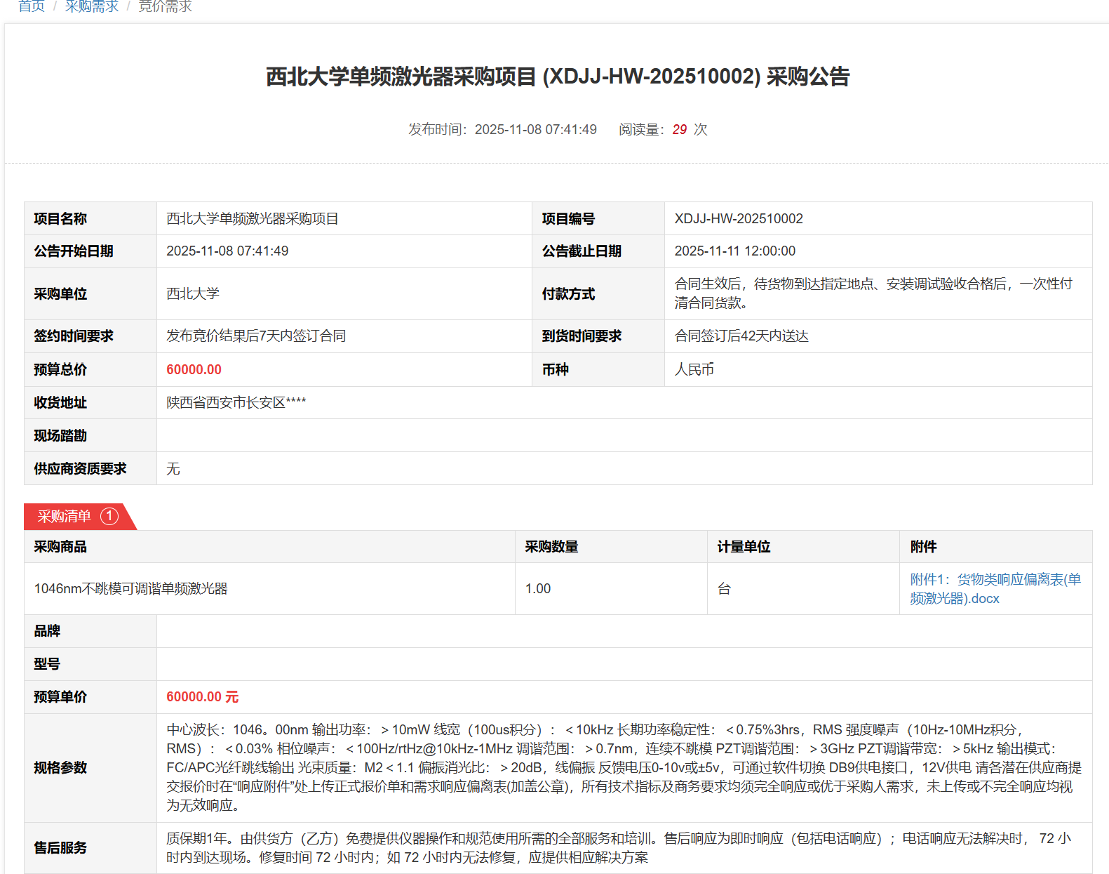 乐投平台单频激光器采购项目(XDJJ-HW-202510002)竞价采购公告