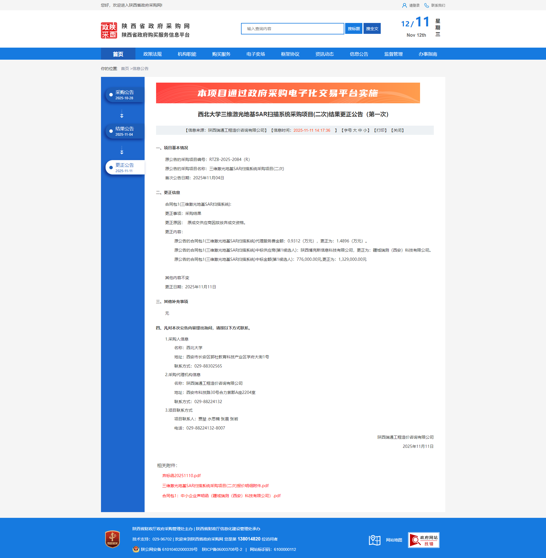 乐投平台三维激光地基SAR扫描系统采购项目(二次)结果更正公告(第一次)