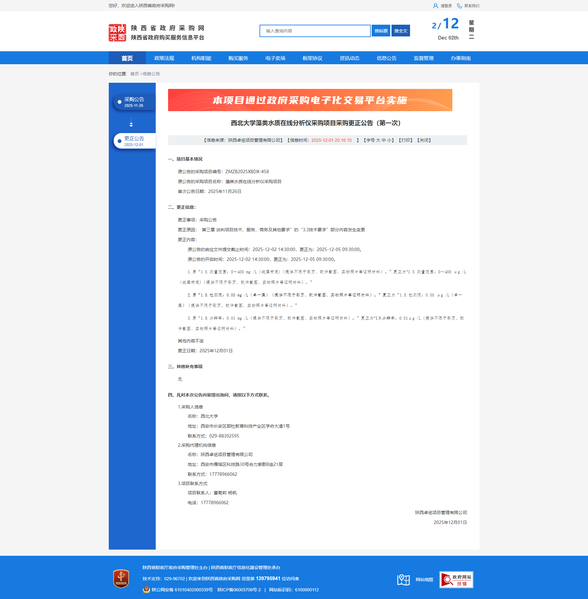 乐投平台藻类水质在线分析仪采购项目采购更正公告(第一次)