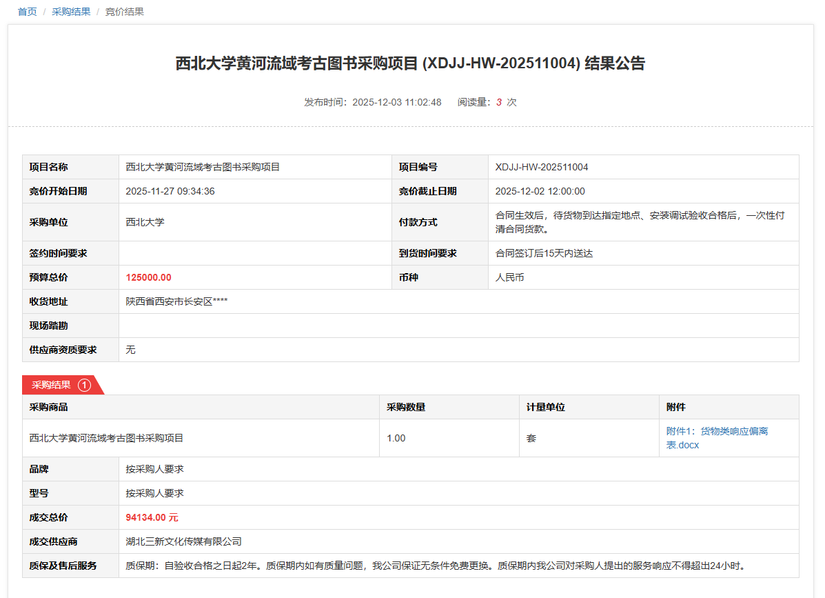 乐投平台黄河流域考古图书采购项目(XDJJ-HW-202511004)竞价结果公告