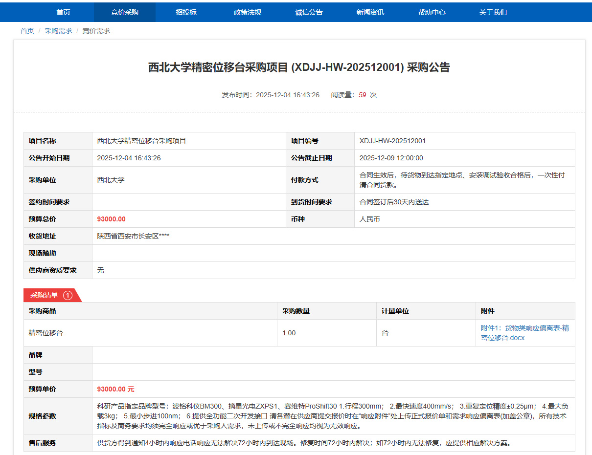 乐投平台精密位移台采购项目(XDJJ-HW-202512001)竞价采购公告