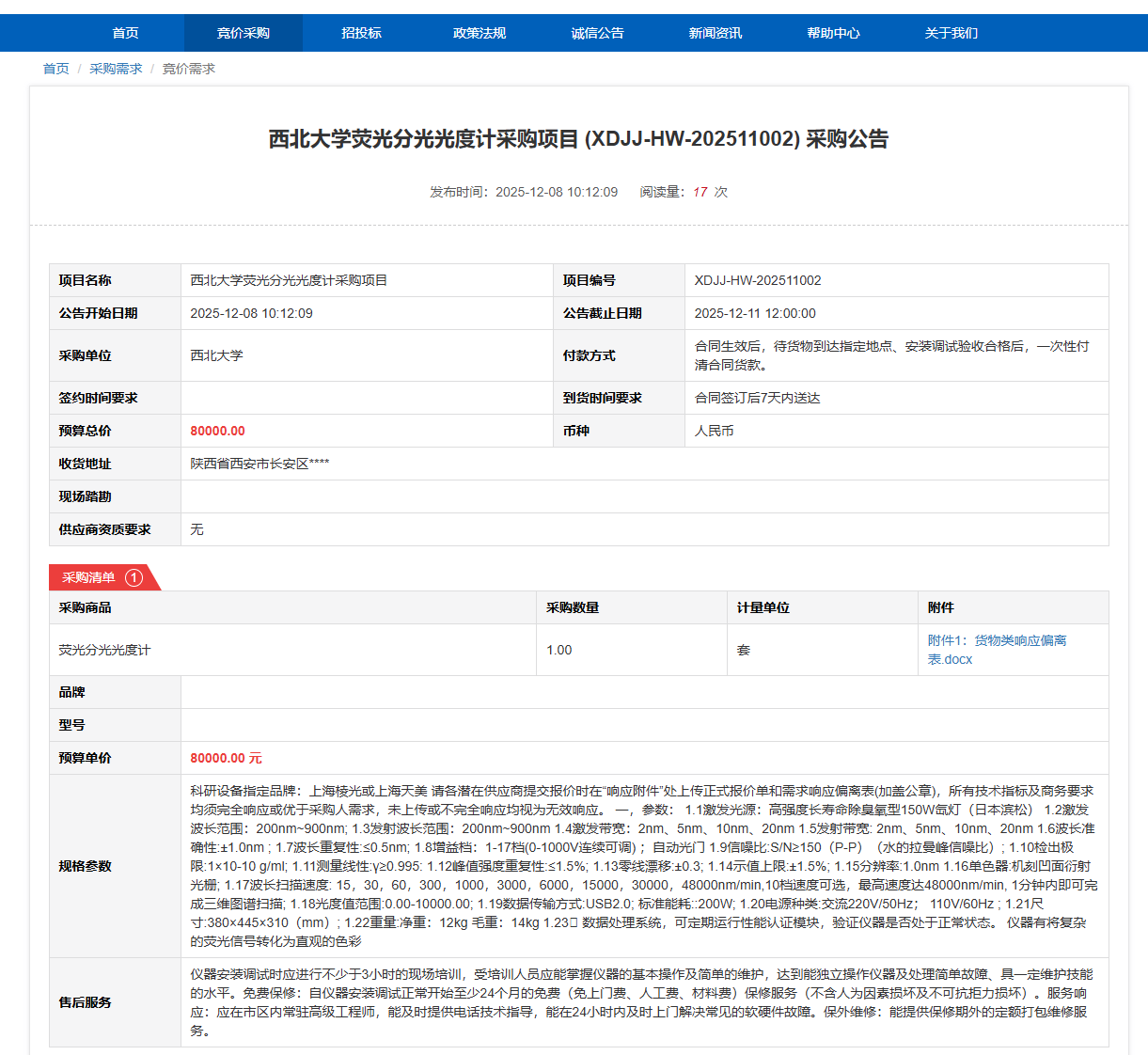 乐投平台荧光分光光度计采购项目(XDJJ-HW-202511002)竞价采购公告