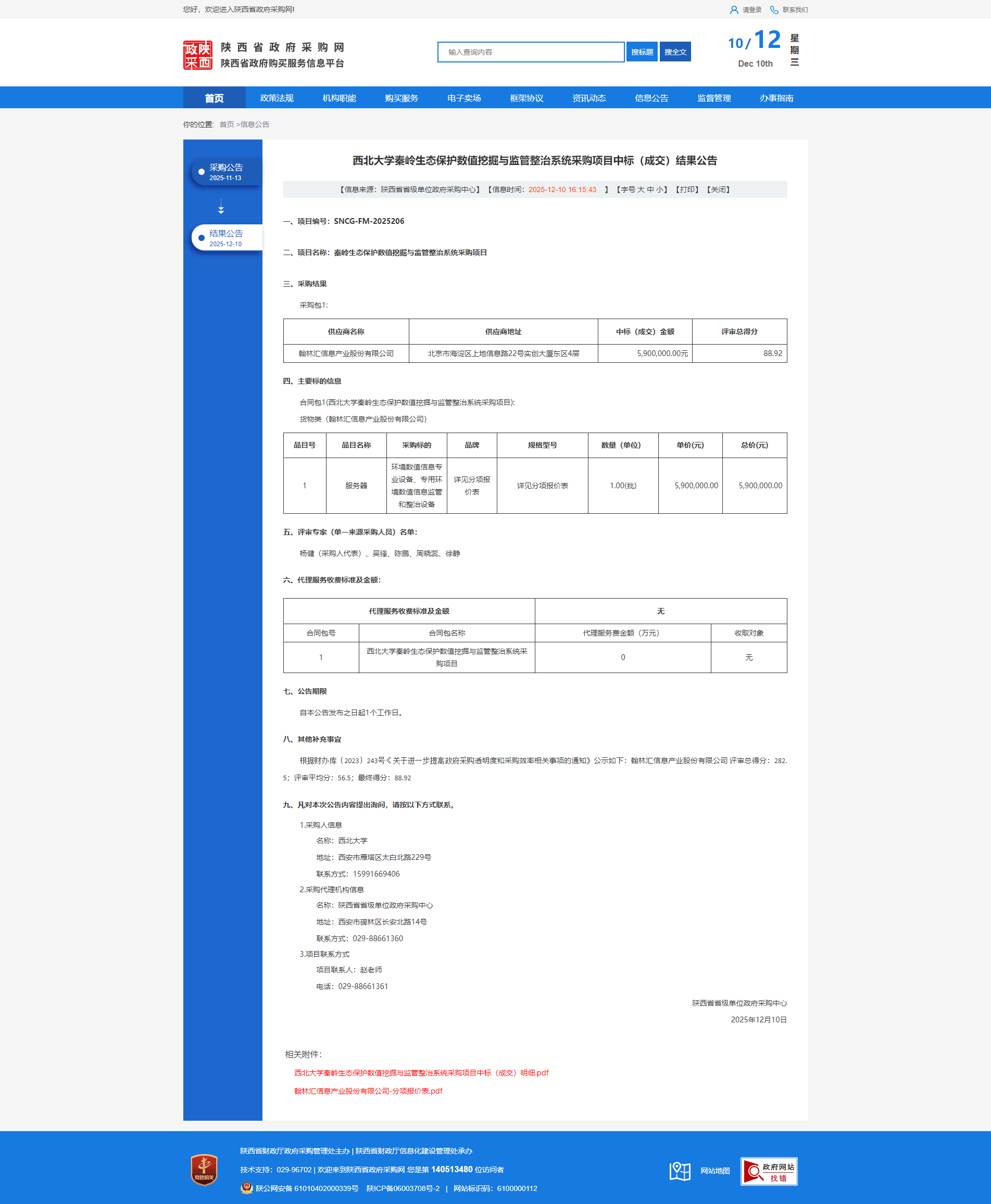 乐投平台秦岭生态保护数值挖掘与监管整治系统采购项目中标(成交)结果公告