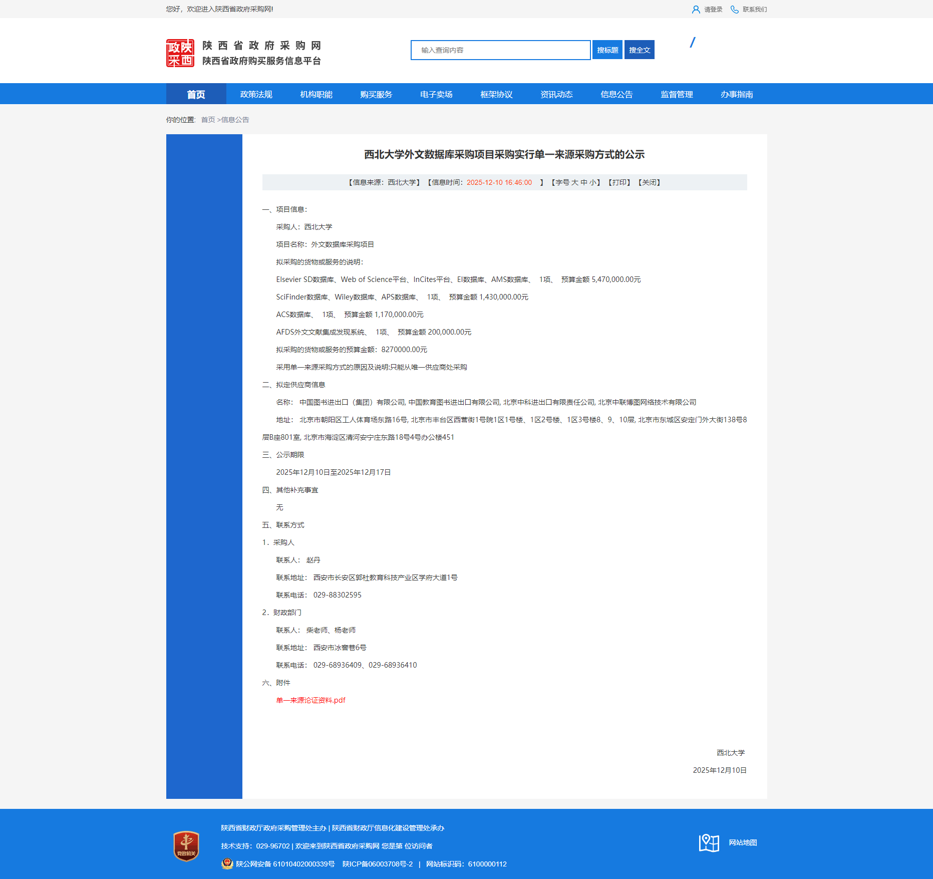乐投平台外文数据库采购项目采购实行单一来源采购方式的公示
