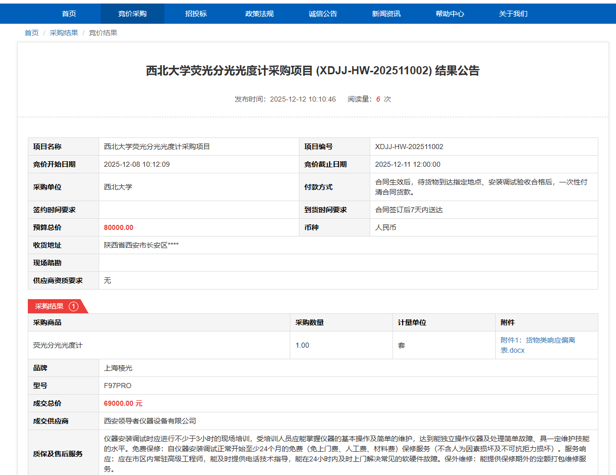 乐投平台荧光分光光度计采购项目(XDJJ-HW-202511002)竞价结果公告