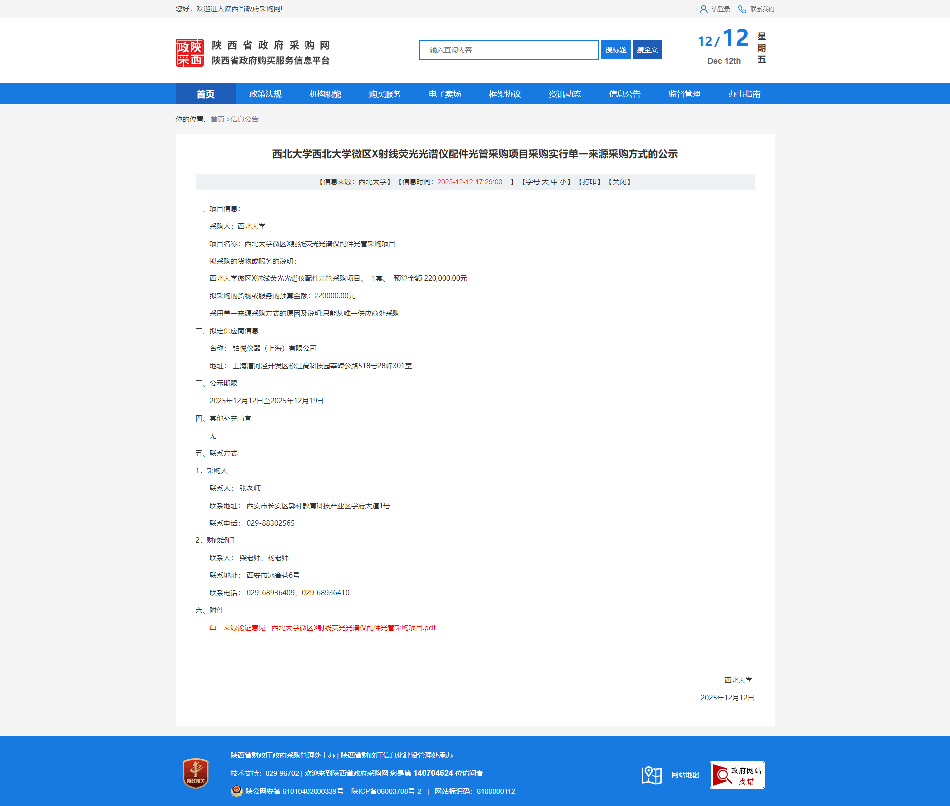 乐投平台微区X射线荧光光谱仪配件光管采购项目采购实行单一来源采购方式的公示