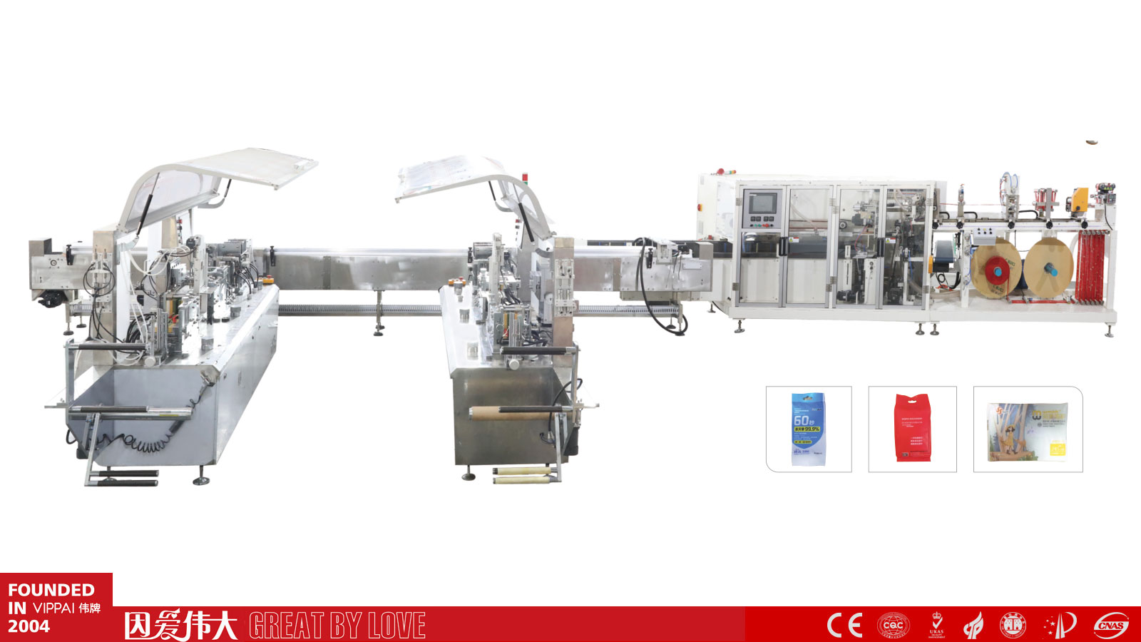 VPD250+VPD900M全自动湿巾套袋机连线 根据客户的要求,设计全自动乐投平台跟装盒机或套袋机连线